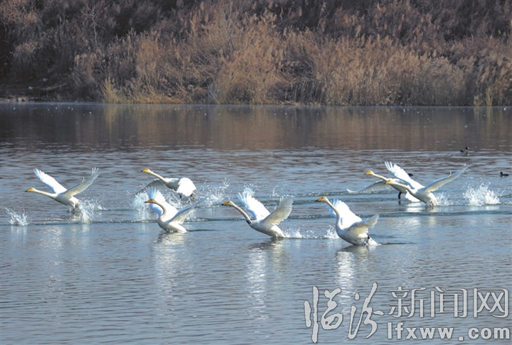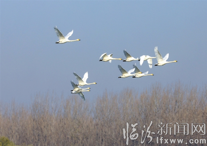 临汾新闻网讯 初冬时节,数量众多的大天鹅、白鹭、赤麻鸭等候鸟在汾河生态湿地临汾城区段嬉戏觅食、展翅飞翔,成为一道靓丽的生态风景线。近年来,随着汾河流域生态环境的持续改善,汾河湿地已成为候鸟停歇休憩、越冬栖息的“生态驿站”。