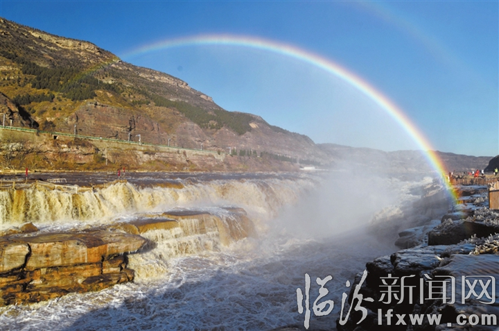 临汾新闻网讯 12月3日,游客在吉县黄河壶口瀑布欣赏“双彩虹”景观。初冬时节,受上游水库调节放水影响,黄河壶口瀑布水量增大,飞溅的水雾经阳光照射,形成季节特有的“双彩虹”景观,吸引游客驻足观赏。