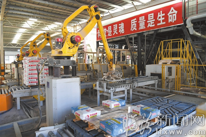 临汾新闻网讯 12月7日,山西大地华基建材科技有限公司在对生产出来的石膏进行自动化打包。该公司是一家集研发、生产、销售绿色混凝土、新型地面透水砖、各类砂浆等于一体的高新技术企业,并建成全省首条年处理100万吨建筑垃圾和工业尾矿资源化生产线,有效推动废弃资源集约、循环利用。