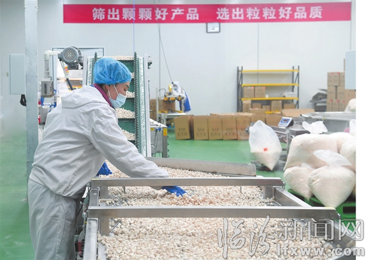 临汾新闻网讯 山西吉美鲜生物科技有限公司是一家集研发、生产、销售于一体的食品深加工企业,该企业总投资3.12亿元,拥有4条FD冻干食品生产线,采用“公司+基地+农户”模式,提供就业岗位120余个,有效带动当地种植、包装、运输等相关产业发展,拓宽了农业产业发展路径。图为该公司工作人员在筛选加工好的果蔬产品。
