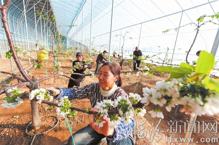 临汾新闻网讯 1月7日,在浮山县天坛镇东鲁村大棚樱桃种植基地,村民们在管护樱桃树。寒冬时节,南霍村大棚樱桃种植基地里,洁白如雪的樱桃花竞相绽放、清香扑鼻。村民们穿梭其间忙着对樱桃树修枝、压枝、授粉,进行一系列精细化管护工作,呈现出一幅幅生机盎然的喜人景象。