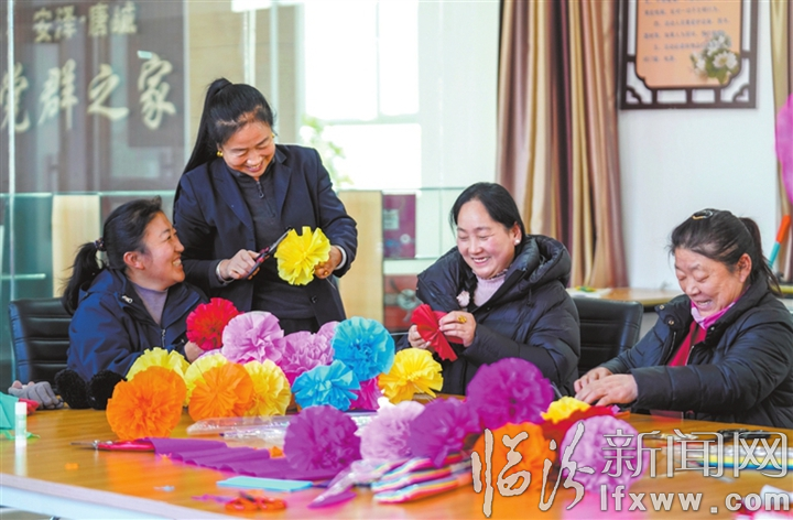 临汾新闻网讯 1月8日,在安泽县唐城镇党群活动中心,妇女们在制作花灯,为表演唐城花灯秧歌做准备。作为省级非遗代表性项目,唐城花灯秧歌一直是当地群众喜闻乐见的传统民俗文化活动,每年农历正月,村民们都会拿着花灯,组成队伍进行表演。