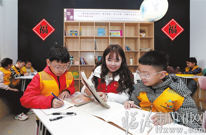 临汾新闻网讯 2月10日,在尧都区解放路街道平阳社区党群服务中心,大学生志愿者正在为社区的孩子们辅导作业。寒假以来,平阳社区组织返乡大学生开展了丰富多彩的“快乐寒假”志愿服务活动,陪伴辖区青少年度过一个安全、充实、有趣、温暖的寒假。