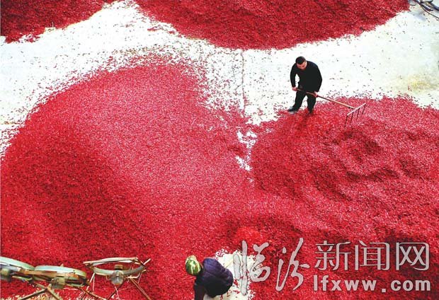 12月15日,在襄汾县赵康镇辣椒交易市场上,椒农正在晾晒辣椒准备销往外地。赵康镇是我省辣椒种植和交易集散地,每年的这个时候,这里就变成了交易的“火热”市场,此时也是椒农们最幸福的时节。 张旦 摄
