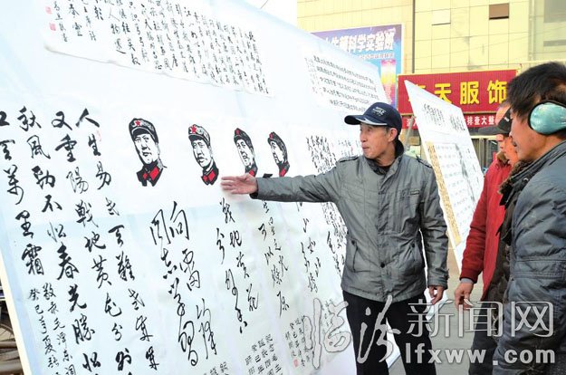12月17日,翼城县老年书画协会县直分会在该县府前广场举办“纪念毛泽东同志诞辰120周年书画展”。此次展出的120幅书画作品不仅展现了该县老年朋友参与艺术、创作艺术的无限热情和良好精神风貌,同时还提醒市民要牢记老一辈无产阶级革命家的丰功伟绩。展览也为市民们提供了一个欣赏书画、陶冶情操、交流心得的平台。 关川摄