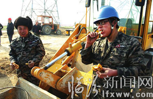 一番紧张忙碌过后,转眼已是下午1点,一个偌大的保温桶里,盛放着工人们的午餐。油饼、咸菜、白开水……一顿简单的午饭之后,来不及耽搁,工人们又投入到各自的岗位,忙乎了起来。