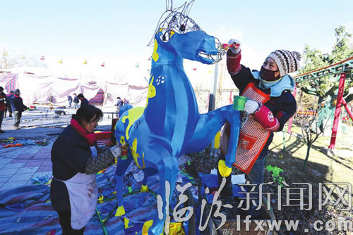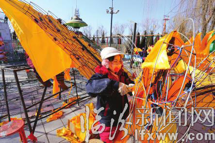 1月20日,滨河游乐园内,工人们正在加紧赶制花灯。