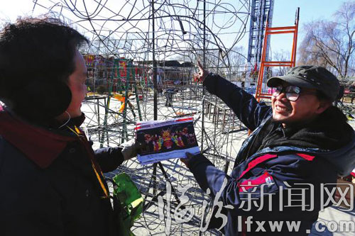 1月20日,滨河游乐园内,工人们正在加紧赶制花灯。据七彩飞龙彩灯艺术有限公司经理曹梦书介绍,本次灯会以“动漫乐园”为主题,共有近30组精品灯组,分为“金马贺岁”动漫世界”“科技教育”三大版块,集声、光、电于一体,将玩乐、赏灯、文化科技融入其中,使灯会不仅具有观赏性,更有一定的知识性和趣味性。