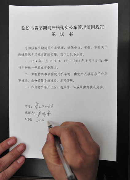 1月29日,山西省临汾市纪委工作人员在《临汾市春节期间严格落实公车管理使用规定承诺书》上签字。