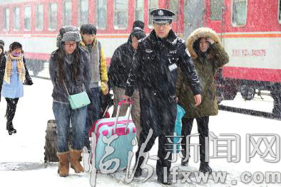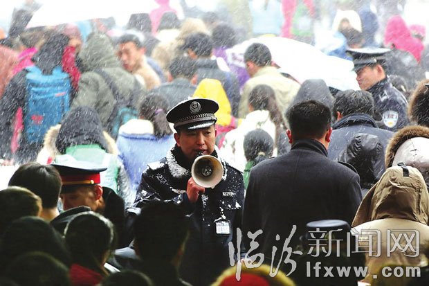 2月4日至6日,我市普降小到中雪,节后铁路返程客流高峰提前到来。临汾铁路公安处迅速启动应急预案,积极应对客流高峰。处领导带领机关值班警力增援临汾站,他们疏导客流、维护秩序,确保旅客安全乘车、有序乘降。沿线派出所的广大干警不畏严寒,放弃了休息时间,积极投入到了安保工作中,将关爱送到旅客身边、群众心里,以实际行动构筑平安春运、和谐春运,赢得了社会群众的赞誉,展示了铁路警察的良好形象。通讯员 张海江 摄