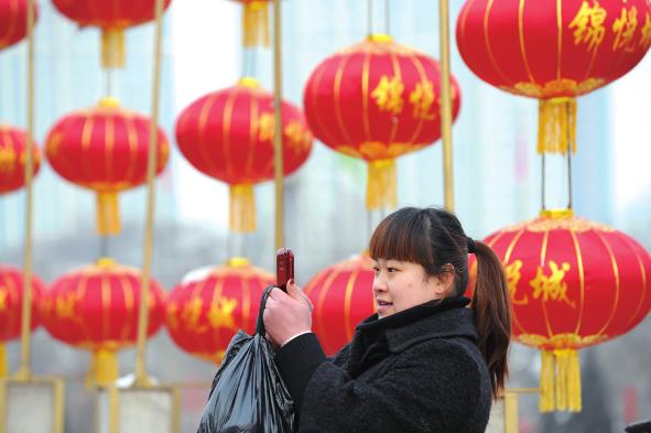 市民们在红红的灯笼群中穿梭、留影,享受着红火美好的假日。