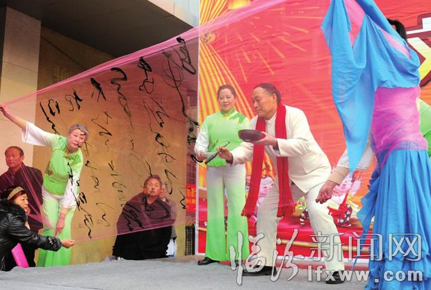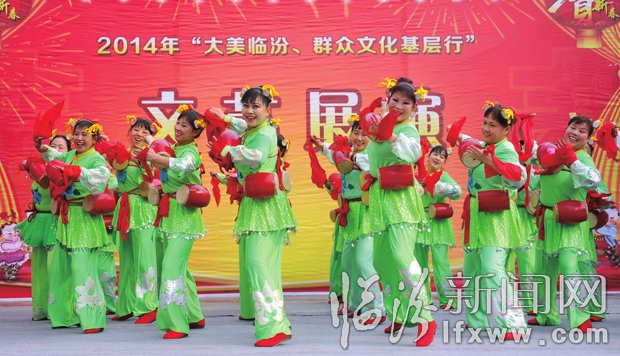 2月10日,2014年“大美临汾,群众文化基层行”文艺展演在市群艺馆前小广场举行,来自全市的14支文艺队伍表演了舞蹈、花鼓以及曲艺等丰富多彩、喜闻乐见的节目,烘托了祥和的节日气氛,喜迎元宵佳节的到来。记者 闫锐鹏 摄