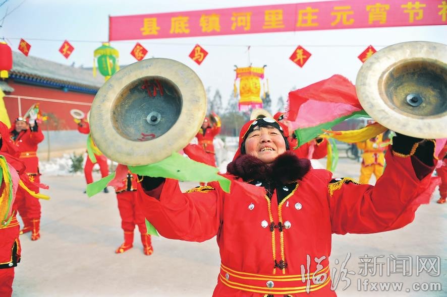 2月14日,在尧都区县底镇河里庄村,富裕起来的村民敲起欢乐的锣鼓。当日,该村举行元宵节社火表演,村民自编自导了舞蹈、歌曲以及话剧等节目庆元宵佳节。 本报记者闫锐鹏摄