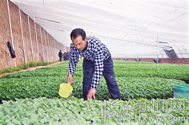 翼城县南唐乡宝丰生态农场大力发展现代农业,探索出“公司基地农户”的发展模式,流转土地七百亩,新建钢架大棚三百余座,并以种植西瓜、葡萄、核桃等优质农作物为主,使村民年人均收入达到二万余元,带领当地群众走上致富路。图为村民们正在为日光温室大棚里的育苗浇水施肥。李成健摄
