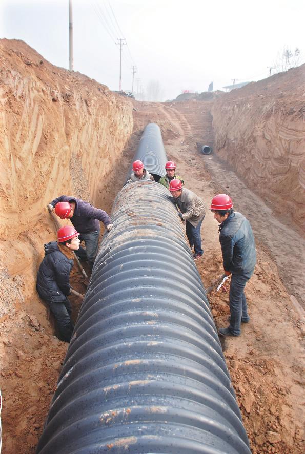 3月1日,在市区秦蜀路南延拓宽改造建设项目工地,工人们正在安装下水管道。该项目北起尧庙迎宾大道丁字口,南至南外环108国道口,道路建设等级为城市主干道路一级标准,道路红线宽60米,两侧各设15米绿化带,项目改造完成后,将进一步完善城市交通网络,提升城市功能和品位。本报记者 李自强 摄