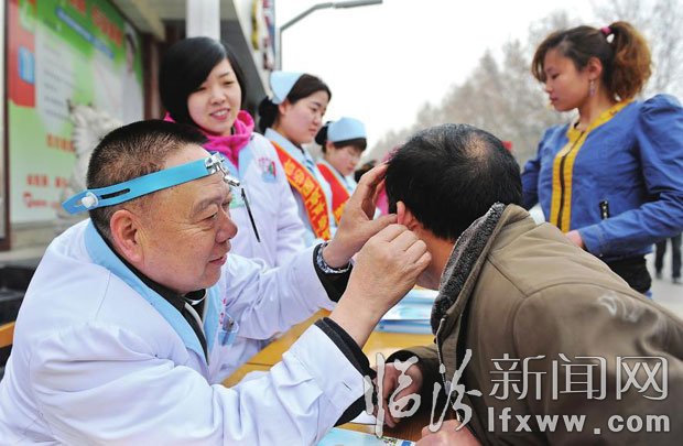 3月3日,在我市迎春北街,市西京耳鼻喉专科医院的医务工作者在为市民检查听力。当日是第十五个全国“爱耳日”,该医院结合全市深入开展的学雷锋活动,组织义务志愿者队伍在社区、广场开展了主题为爱耳、护耳健康行活动,以科普保健、现场检查等形式,倡导健康科学的护耳知识。 记者 闫锐鹏 摄