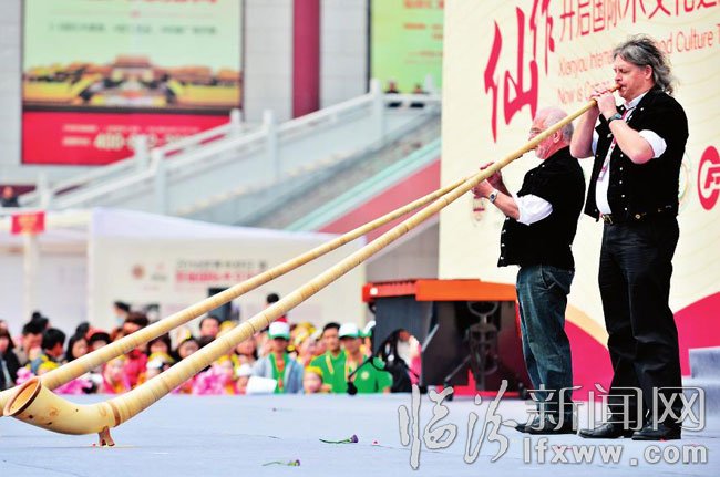 3月21日,来自瑞士的两名艺术家在国际木文化节上演奏阿尔卑斯长号。