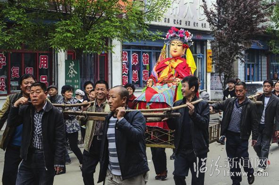 日前,尧都区刘村镇东南部的泊庄村上演了走亲习俗——接“娘娘”。威风锣鼓队一路上不停地敲打着,数名壮汉抬着“娘娘”行至泊庄大戏台,村民们蜂拥而至,场面十分红火。