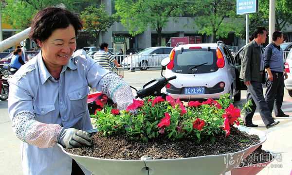 4月29日,临汾市园林局的工作人员在鼓楼广场上栽种鲜花。山形的花架上种满了垂吊牵牛、四季海棠等鲜花,引来了市民纷纷驻足。