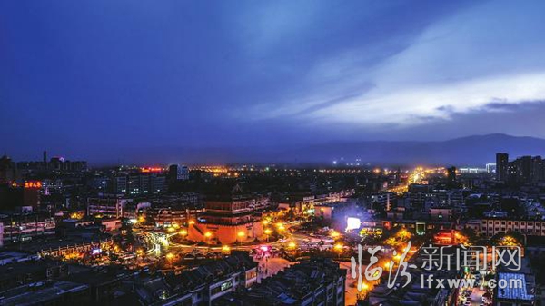 五一假期的最后一天,入夜的临汾夜色璀璨迷人,路灯一排排亮起,市民们聚在鼓楼广场跳着健身舞。