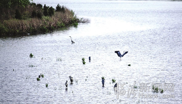 5月11日,记者在洪洞县恒富大桥南侧,数只水鸟在此嬉戏。