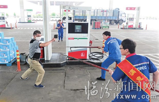 当日,中石化山西临汾分公司在大型油库和加油站举行反恐演练,目的是进一步提高员工反恐意识,增强应对突发暴恐事件的能力。 记者 李虎威 摄