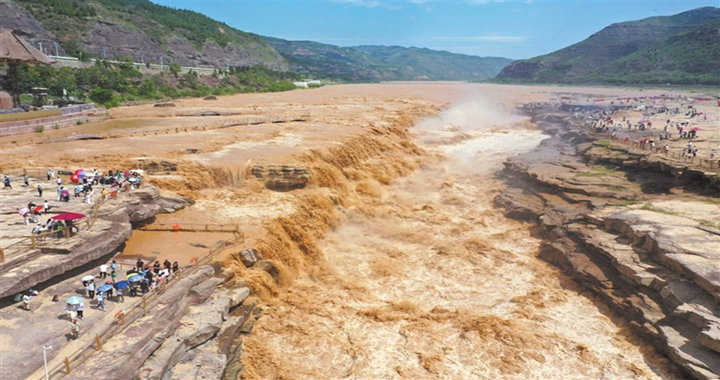 7月4日,游客在吉县黄河壶口瀑布景区欣赏壮美瀑布群景观(无人机照片)。 近日,受上游降雨增多和万...