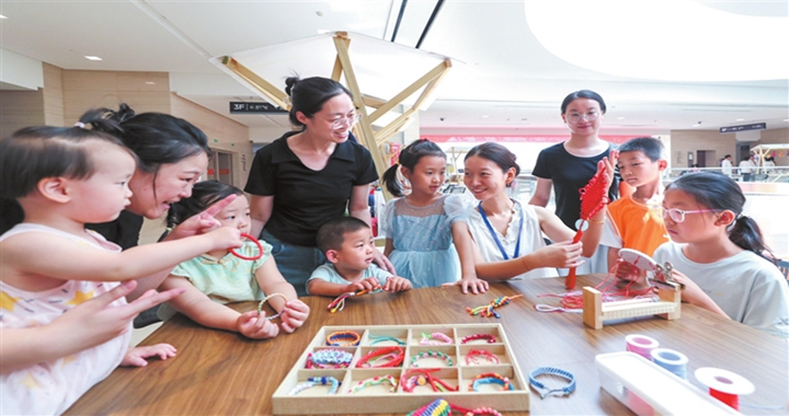 7月12日,在市博物馆非遗手工课堂上,指导老师在和孩子们交流绳结技艺。暑假期间,市博物馆依托本土...