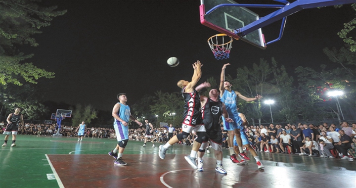 7月10日,在市汾河文化生态景区灯光篮球场,球员们在赛场上激烈角逐。 2025年临汾市消夏篮球赛开...
