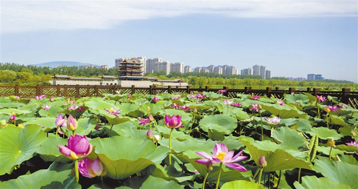 盛夏时节,在临汾市文化生态景区,大片的荷花开得正艳。翠绿的荷叶间,粉白相间的荷花竞相绽放,构成...