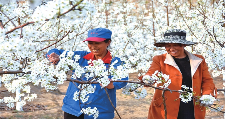 4月7日,在尧都区县底镇城隍村,村民景耀奎夫妇在果园修剪苹果树。近年来,县底镇依托当地的土壤和气...