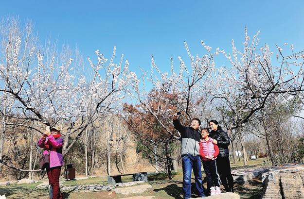 3月25日,在尧都区涝洰河公园,天空湛蓝,白云点缀,花儿开了,树叶绿了。许多市民来到公园,吮吸春天...