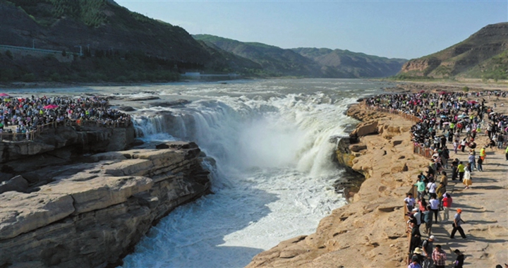 “五一”假期,吉县黄河壶口瀑布景区迎来客流高峰,瀑布奔腾咆哮的壮美雄姿吸引了众多游客前往观赏。...