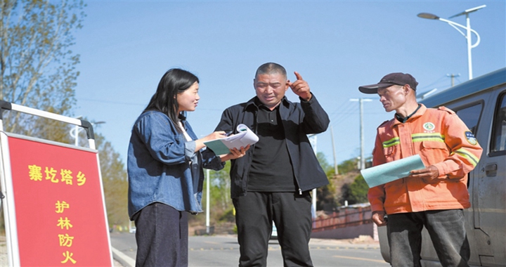5月7日,在浮山县寨圪塔乡石口村森林防火检查点,值守人员在为过往司乘人员讲解防火注意事项。随着旅...