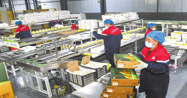 近日,在隰县广鑫农业科技股份有限公司出口水果包装车间内,工人正在对玉露香梨进行等级分拣。该公司...