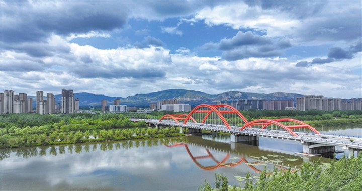 5月9日,临汾市汾河文化生态景区碧空如洗、清雅静美,满目绿意、处处皆景。如今,绿色已成为临汾最亮...