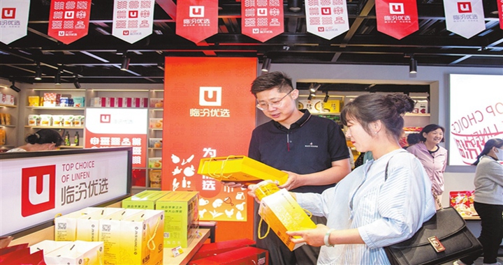 5月10日,在市区“临汾优选”御景水城旗舰店,市民在选购临汾特色农产品。 “临汾优选”选址城市...