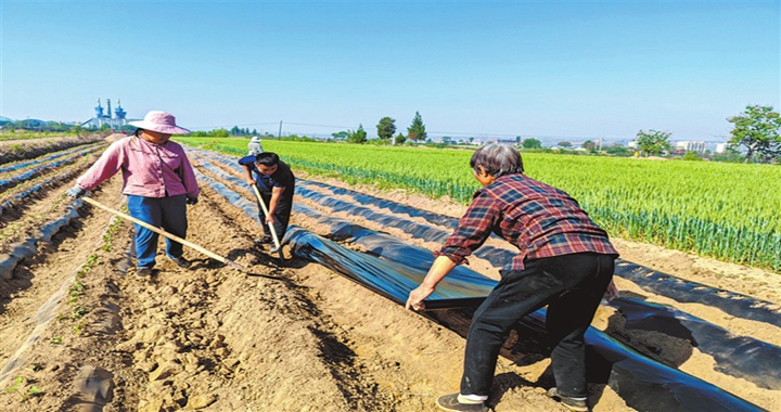 5月11日,在襄汾县新城镇柴村的田间地头,农民正在种植红薯。立夏过后,当地农民抢抓农时,积极种植...