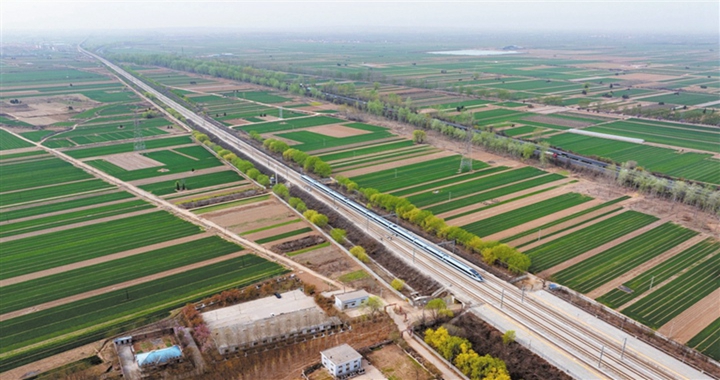 4月4日,在襄汾县南贾镇境内,一组动车在田间行驶。襄汾县境内大西高铁沿线春意盎然,景色宜人,农田...