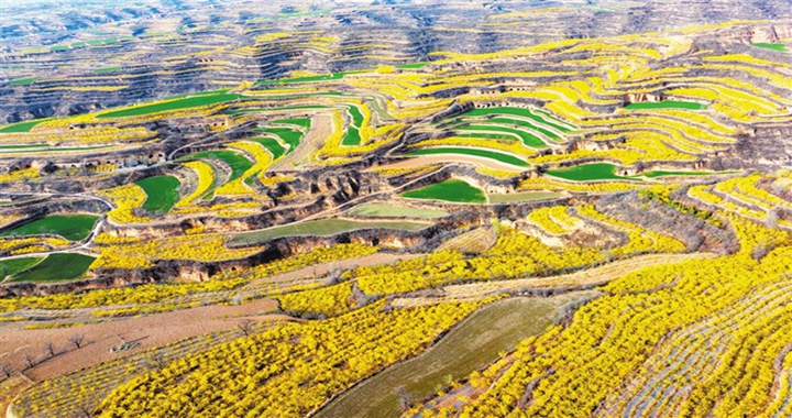 春日时节,黄河一号旅游公路襄汾县丁村旅游公路沿线特色农业观光带的油菜花成片绽放,呈现出金黄色的...