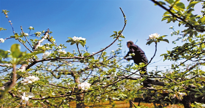 4月10日,在襄汾县新城镇宋村,果农正在对苹果树开展疏花作业。当前正值春季果树管理关键期,当地果...
