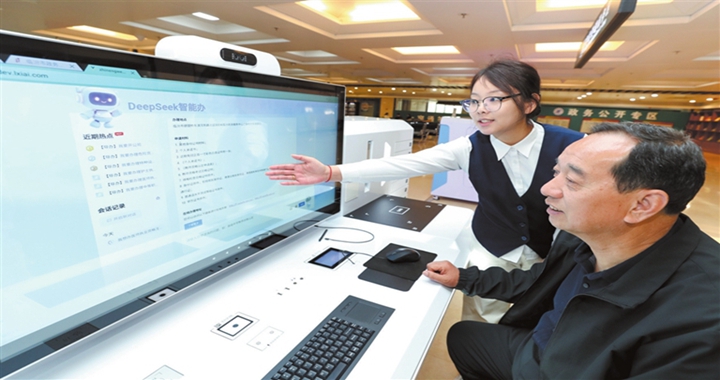4月11日,在市政务服务中心办事大厅,工作人员在指导办事群众运用“DeepSeek智能办”办理相关业务。...