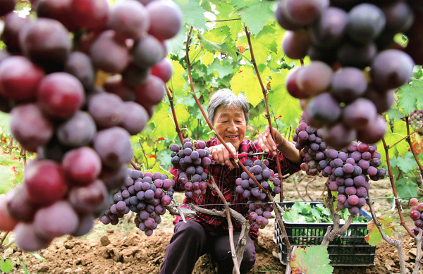 9月13日,尧都区贾得乡北席村的王大妈正在自家葡萄园里收获葡萄。北席村是当地有名的葡萄种植村,每到收...