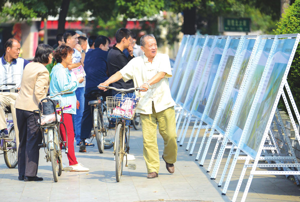 9月15日,市民在鼓楼广场观看由市规划局设立的“临汾市城市建设改造重点项目”系列宣传展板。