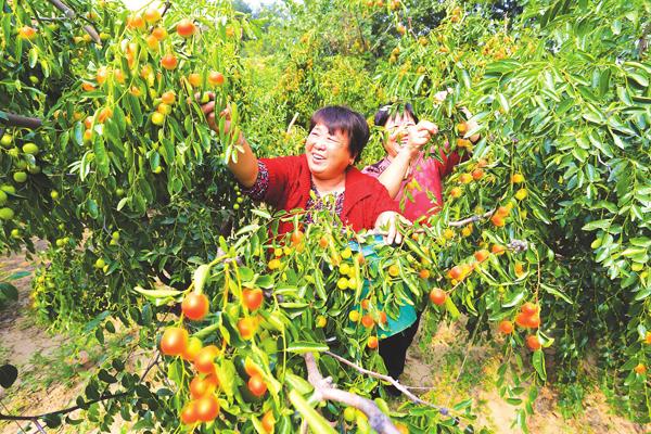 9月20日,在尧都区段店乡千伏村冬枣基地里,枣农段如新正在采摘成熟的冬枣,脸上洋溢出丰收的喜悦。
