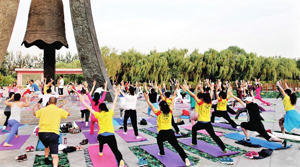 8月23日,在市区廉政广场,我市瑜伽爱好者在体验户外瑜伽的快乐。当日,由市区多家健身会所联合举办的临...