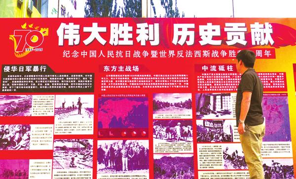 8月25日,临汾市影剧院“伟大胜利历史贡献”的宣传版面吸引了众多市民驻足观看。