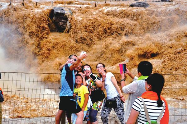 7月22日,游客在吉县黄河壶口瀑布拍照留念。当日,受陕北榆林强降雨影响,黄河晋陕峡谷多条支流出现山洪...