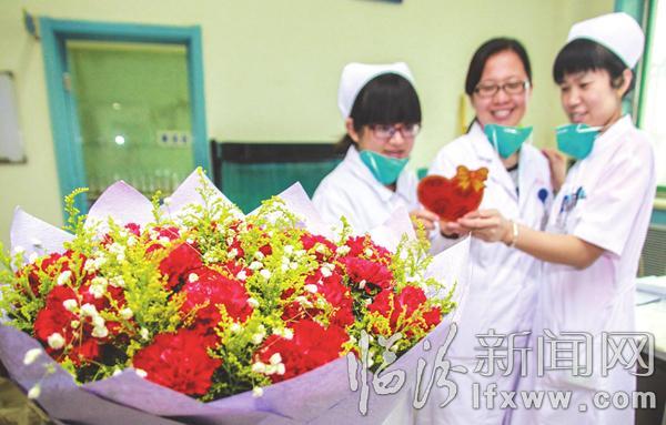 5月11日,在临汾莉轶糖尿病医院,患者代表向护理人员送去鲜花的祝福。当日,该医院举行了“天使颂歌”护...