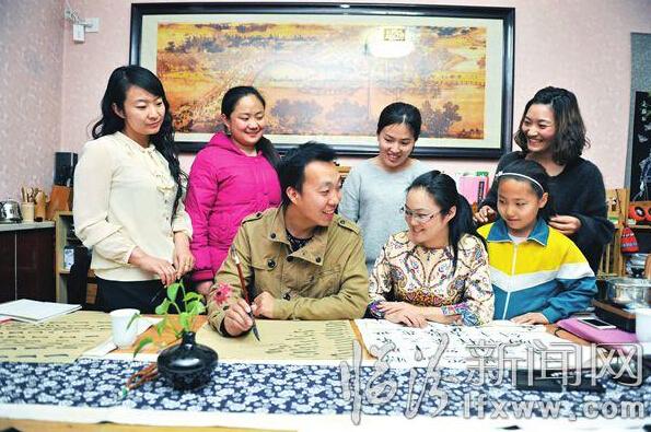 五月四日在我市雨禾佳茶艺培训中心学员在老师的指导下练习书法。该中心在传播茶艺知识的同时, 开设女性...